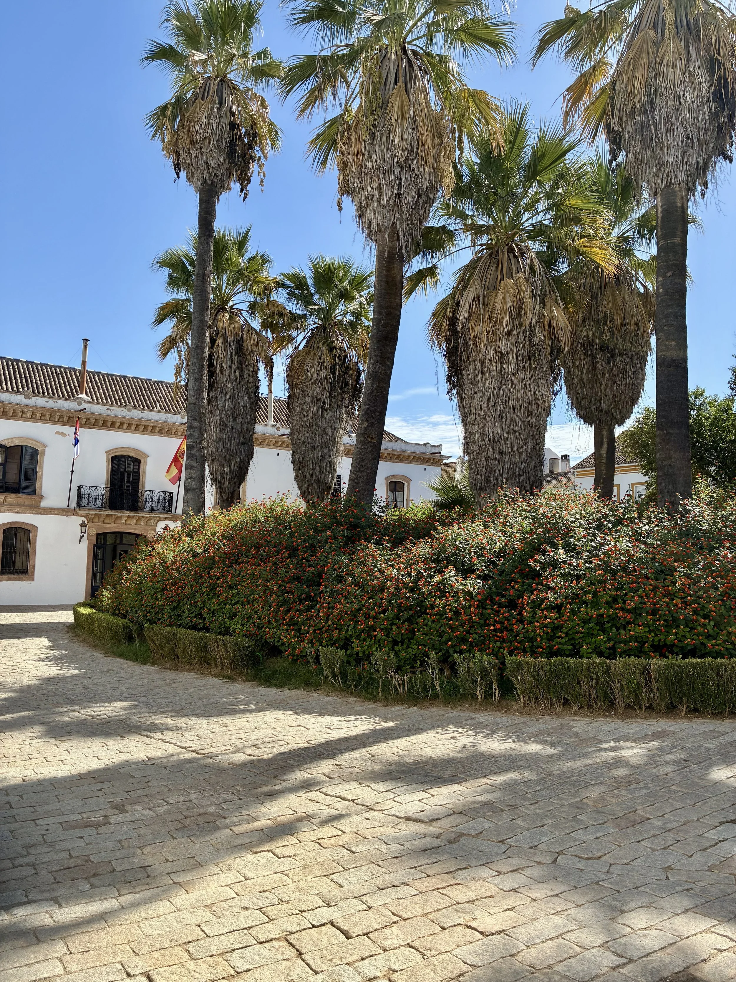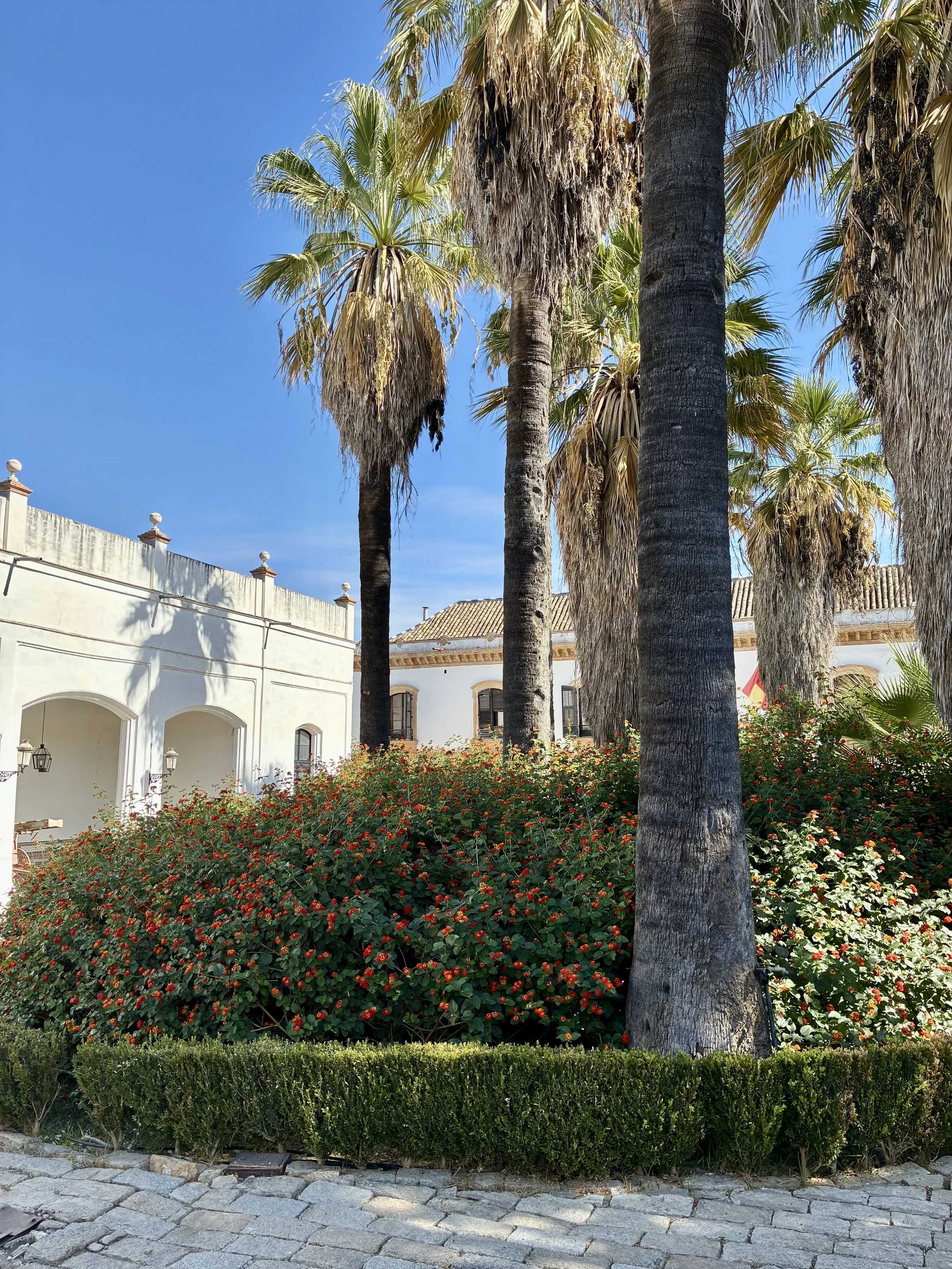 Es la entrada del palacio que da a la cuadra y a la portada del palacio. Un espacio con vistas a la iglesia y palmeras altas.