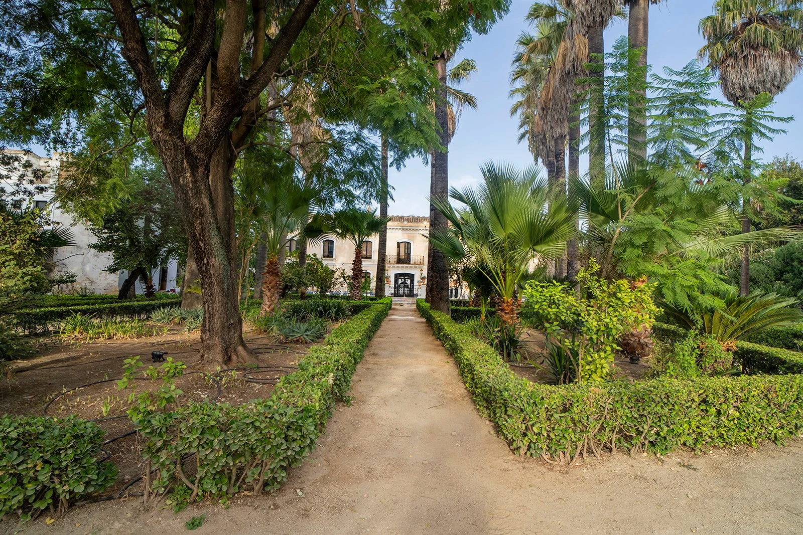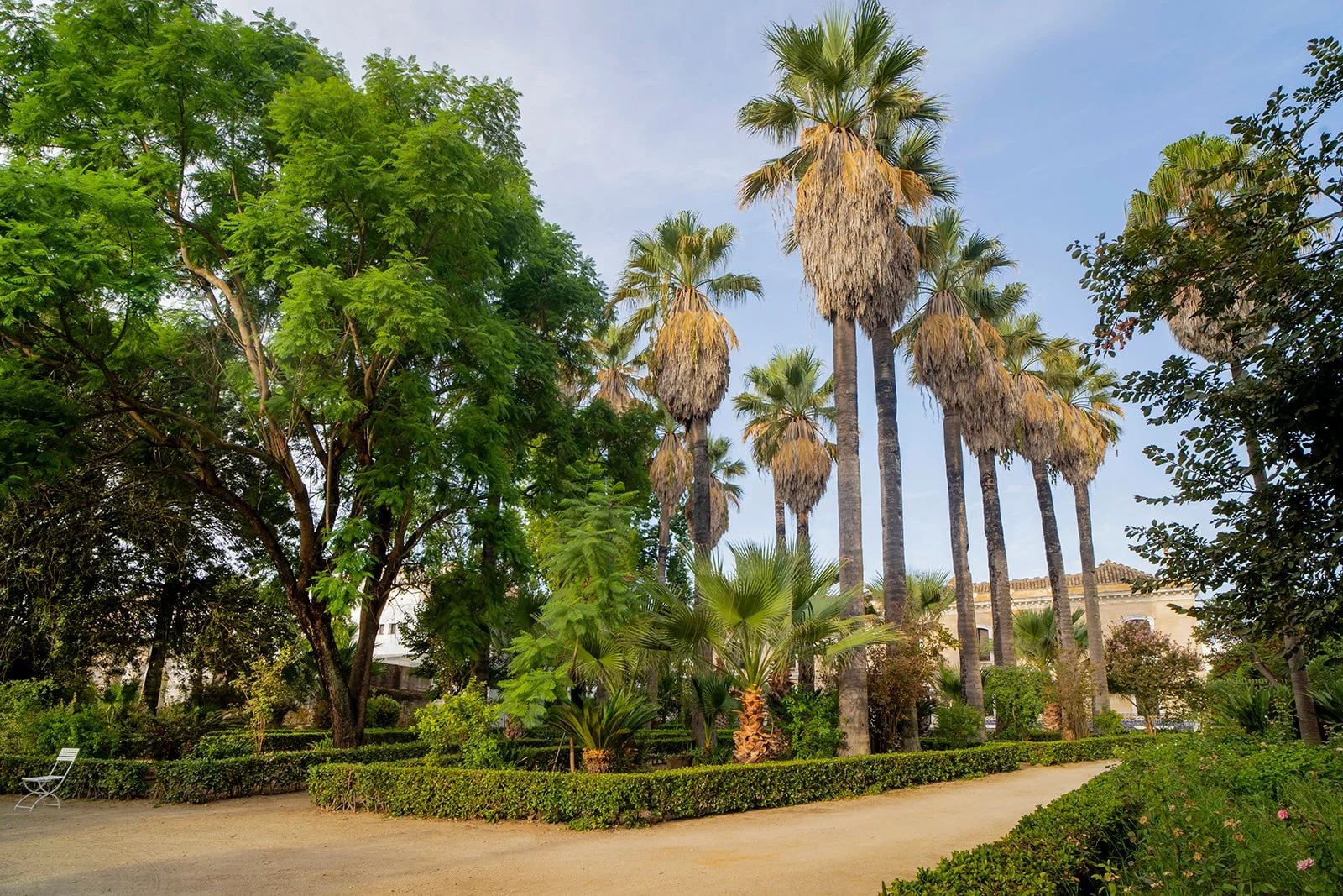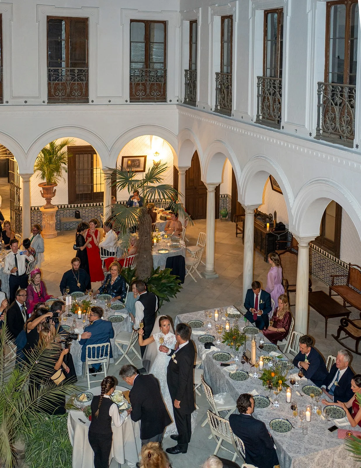 El patio central, con su aire francés y a la vez andaluz, es el corazón del palacio: un espacio lleno de luz y belleza arquitectonica, perfecto para recepciones o ceremonias al aire libre.